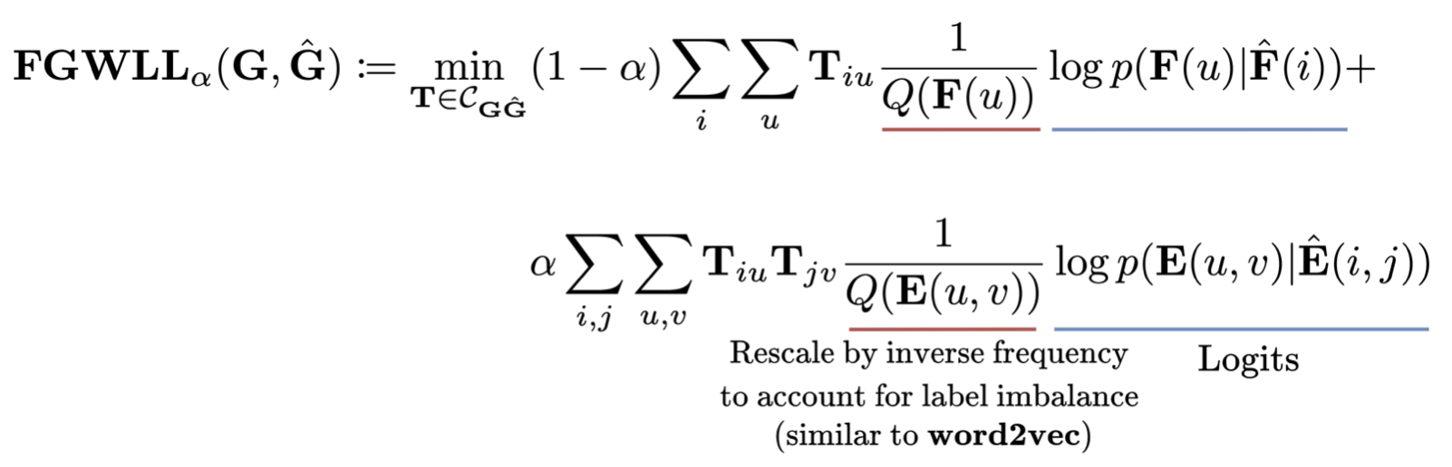 This is where OT comes back in to take care of permutation invariance. We match both nodes and edge features in a permutation invariant way using an OT pseudometric, the Fused Gromov-Wasserstein (FGW) \(\href{#14}{[14]}\) discrepancy. We express the loss function \(FGWLL_a(\mathbf{G}, \hat{\mathbf{G}})\), between input and reconstructed graphs \(\mathbf{G}\) and \(\hat{\mathbf{G}}\), using as cost functions \(c_1\), \(c_2\) the product of the log-likelihood of the target labels and a rescaling factor.